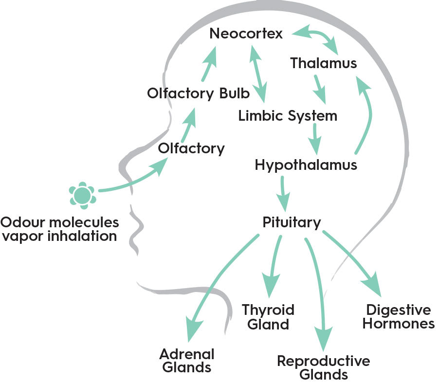 Because of this direct olfactory pathway to specific areas of the brain, inhaling essential oils can work very quickly and much more efficiently than oral remedies. From when you first inhale the oil to the corresponding brain trigger and gland secretion is less than a few seconds.
